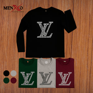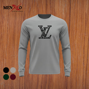 The classic, crewneck silhouette features a striking, oversized monogram graphic centered on the chest. The graphic is distinguished by its intricate, embossed-look pattern in contrasting white/silver, giving the appearance of luxury and depth. Made from a soft, high-quality knit fabric, the LV NOIR ensures both comfort and durability. This stylish Full Sleeve T-Shirt is your refined essential, perfect for layering under a jacket or wearing standalone to make a confident statement.