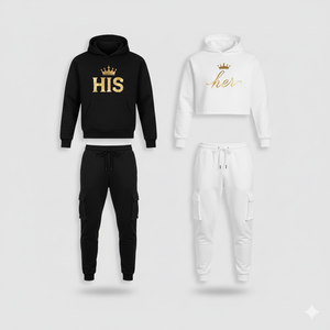 Unleash your style with the MR & MRS HOODIE SET from MENXOXO, a versatile unisex streetwear set that blends bold design with ultimate comfort. This iconic ensemble features a cropped black hoodie with a striking red "X" logo on the chest, paired with high-waisted black cargo sweatpants showcasing matching red "X" accents on the legs. The full-length black hoodie option, complete with the same red "X" emblem, pairs seamlessly with relaxed black joggers, also adorned with the signature "X" detail.