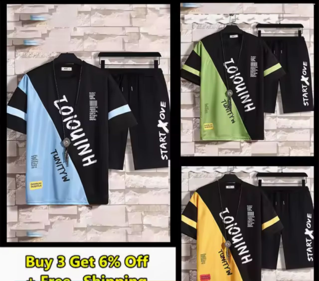 - Yellow-Black Set (Bottom-Right): Black body with yellow accents and "LOIQINH," "TUNITYH," and "START XOVE" in bold white lettering. Shorts in black with yellow trim. Vibrant and eye-catching, ideal for standing out in casual settings.