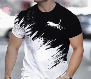 Unleash your wild side with the Street Panther Tee, designed for men who love bold, urban streetwear. This black-and-white contrast T-shirt features a fierce leaping panther graphic with dynamic brush-stroke patterns, giving it an energetic and stylish edge.