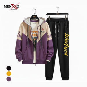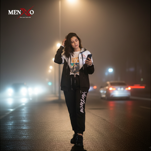 The Urban Flow Tracksuit is designed for men who love streetwear with an athletic edge. Featuring a bold black and white contrast design, it combines a zip-up hoodie jacket with matching jogger pants. The dynamic typography prints on the chest, sleeves, and pants add a trendy street-style vibe.