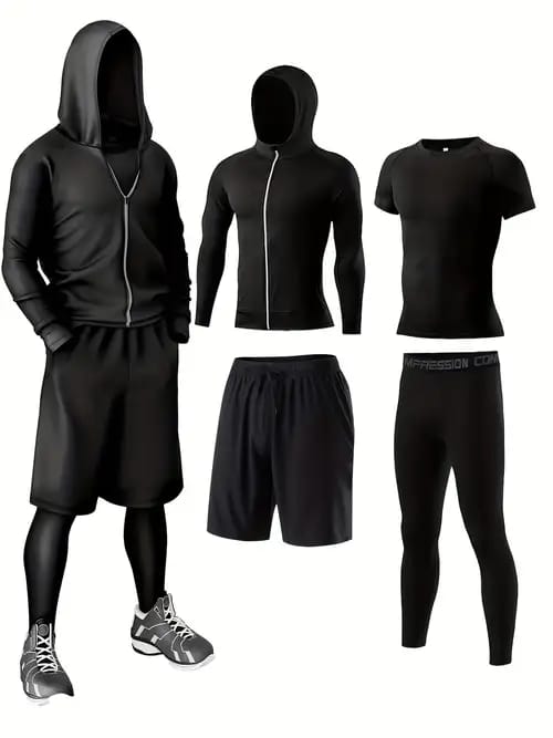 The Versatile Workout Ensemble is a comprehensive all-black athletic apparel set designed to cater to a wide range of physical activities, from gym workouts to outdoor sports. This multi-piece outfit includes a hooded zip-up jacket, a long-sleeve compression top, a short-sleeve compression shirt, loose-fitting shorts, compression tights, and a pair of athletic shoes, offering flexibility and functionality for various fitness levels and preferences.